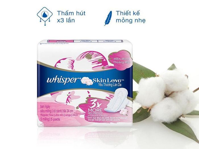 - Whisper Skinlove ultra-thin pads with wings offer extra protection and stay in place, giving you the confidence to move freely.