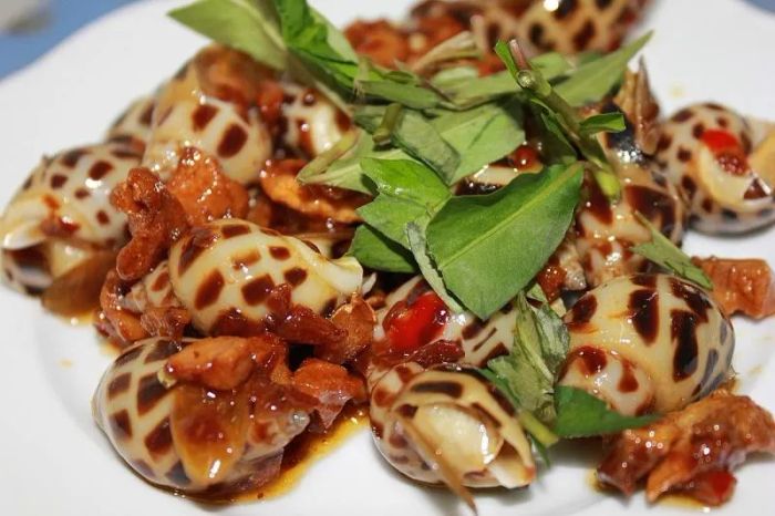 - Step 3: Sauté all the garlic until fragrant. Remove half of the garlic and set aside. Then, stir-fry the snails on high heat, stirring quickly and evenly. Season to taste, add lime leaves, and turn off the heat once the sauce thickens. Serve with some fresh herbs and enjoy!
