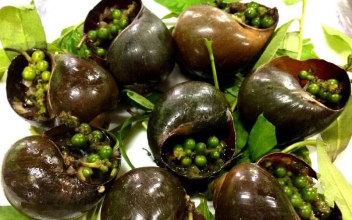 Grilled apple snails with green pepper offer a spicy and bold flavor that gives you a unique culinary experience. The heat from the green pepper combined with the chewy and fragrant snail meat will make you crave more with every bite.