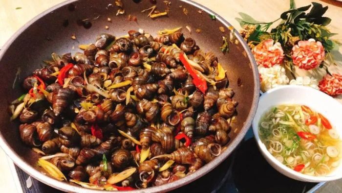 - Step 3: Sauté garlic and ginger until fragrant, add the black pepper, stir well, then add the snails and stir-fry. Season with fish sauce, white wine, sugar, chili sauce, and vinegar. Stir everything together.