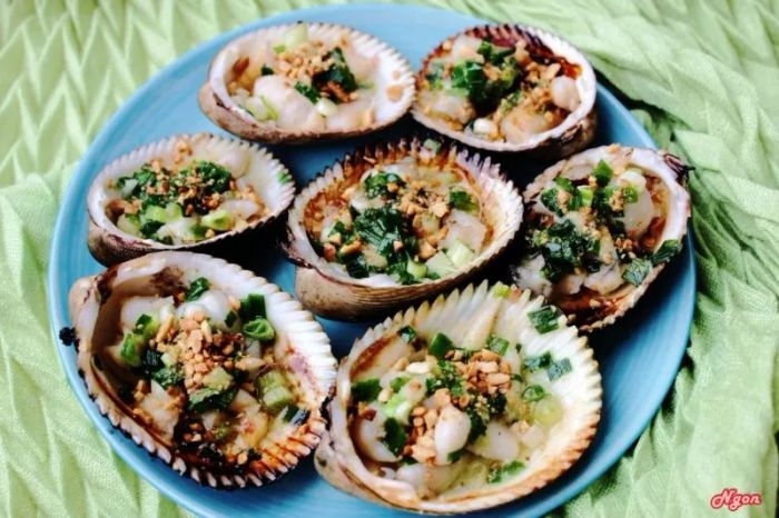- Step 2: Open the scallops, remove the meat, and rinse it thoroughly. Place the butter and garlic mixture on top of the scallop shells, then sprinkle with raw garlic. Put the scallop meat on top and place them on the grill.