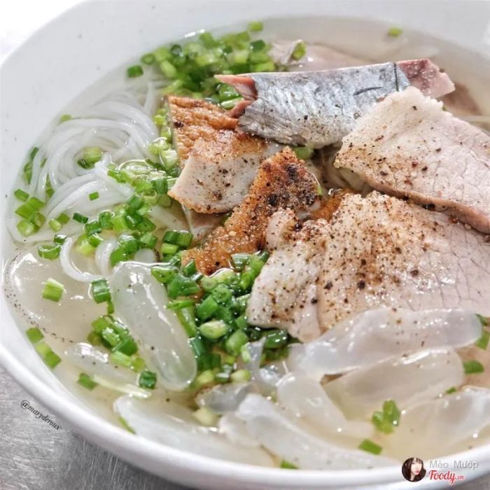 Phan Rang Jellyfish Noodles is a must-try dish when visiting Ninh Thuận. To create the perfect bowl, the chef must carefully select the jellyfish and prepare the broth to ensure the natural flavors shine through with minimal seasoning. The jellyfish used is small, about the size of a thumb, with a white, thick, and coconut-like texture. The broth is made from a local fish called ‘liệt,’ a small fish with a tail resembling a bow. The fish is boneless, sweet, and tender. Additionally, fish cakes made from famous local fish like thu, nhồng, and đối are used. The fish is deboned, minced, and shaped into small balls before steaming. This results in a light yet flavorful bowl of jellyfish noodles that is not overly heavy. You can enjoy this dish at Bún Sứa – Mì Quảng, located at 70 Lê Lợi.