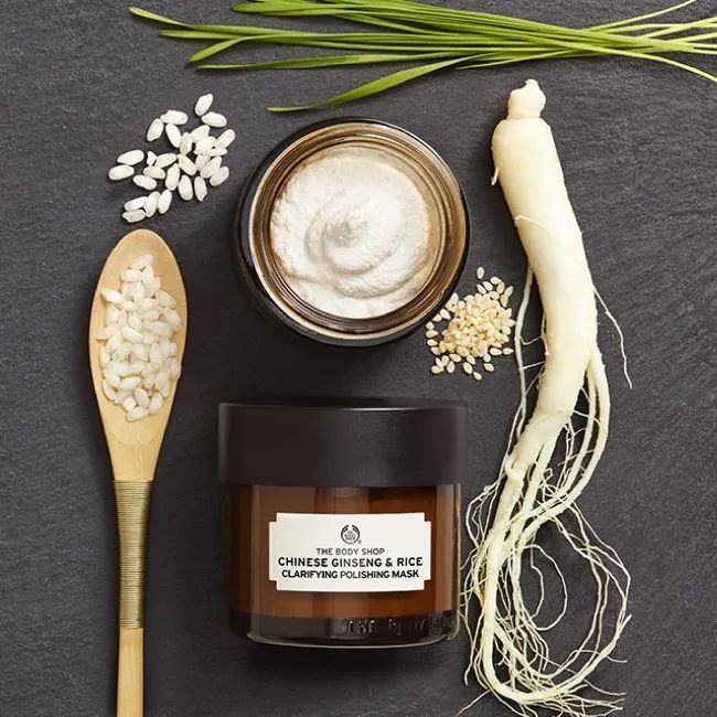The Body Shop Chinese Ginseng & Rice Clarifying Polishing Mask blends rice extract and Chinese ginseng with organic sesame seed oil from Nicaragua to rejuvenate and deeply hydrate dull, uneven skin. This mask brings life and radiance back to your complexion.