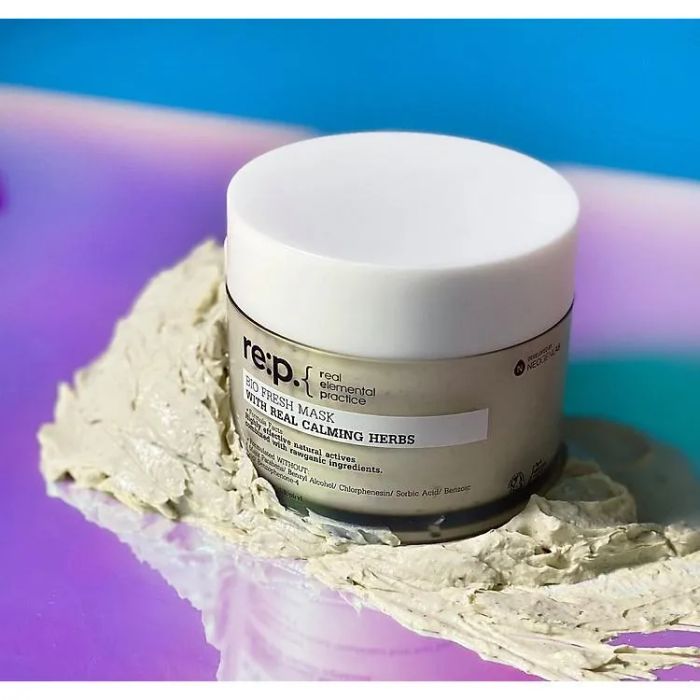 The RE:P Bio Fresh Mask With Real Calming Herbs is a clay mask from the Korean skincare brand Re:p. It is formulated with volcanic clay from Hawaii, Danish rose, and jasmine flowers, helping to remove excess oil, tighten pores, soothe, hydrate, brighten, and even out the skin tone.