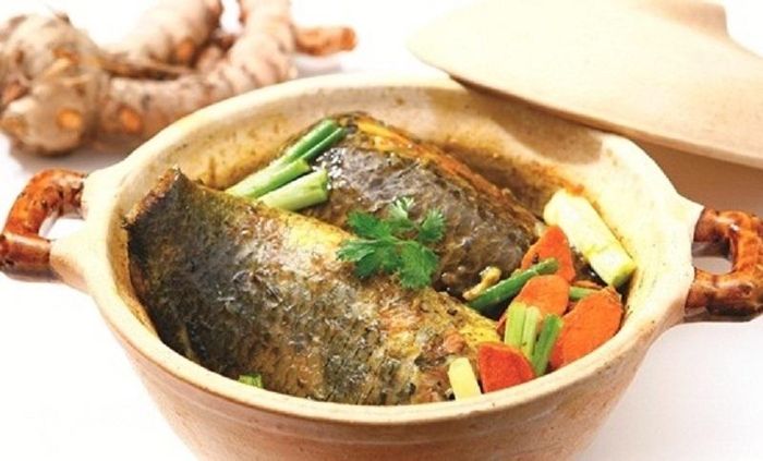 - Step 4: Sauté part of the garlic, shallots, and spring onions until fragrant. Then, add the fish to the pot. Next, add the crushed turmeric and season with fish sauce, pepper, sugar, and chili.