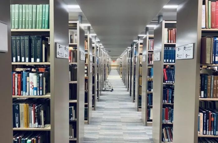 The university's library spans two floors. The first floor includes reading rooms with 150 seats, textbook borrowing areas, and a photocopying service. The second floor offers reading rooms for magazines and foreign books, as well as a conference room. The total library space is 2,500 square meters.