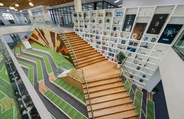 - Library: The heart of VinUni, the library is one of the most important study spaces for students. With two floors and a total area of 4000 m², it can accommodate 1000 students at a time. The library’s architecture draws inspiration from the sunrise over the terraced fields in northern Vietnam. It is an electronic library with rich online databases rather than traditional printed books, featuring two studio labs, one tech lab, several group study rooms, and open student learning spaces.