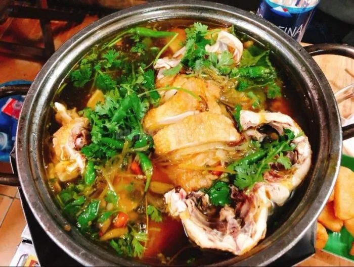 Lẩu Gà Ớt Hiểm 109 has become a popular spot in Saigon, known for its rich, flavorful hotpot that is prepared with great care. The chicken used in the hotpot is always of high quality and safe to eat. Before being cooked, the chicken is fried to achieve a firm, tender texture that’s full of flavor, unlike factory-farmed chicken. The chicken is then simmered with chili peppers and goji berries, creating a savory and unique hotpot. The dipping sauce is simple but perfectly balanced, made with fish sauce, salt, and lime.
