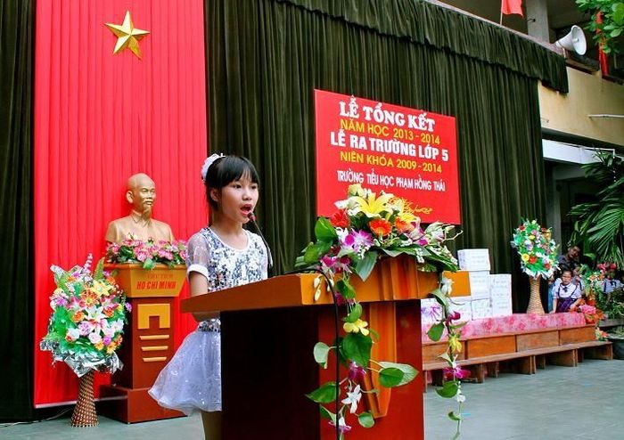 The cicadas' songs fill the air, and the red clusters of flame trees have begun to bloom, signaling the arrival of summer. Time has passed so quickly. It feels like just yesterday when the sound of the school drum marked the beginning of a new school year, full of hopes and plans. Yet here we are today, at the closing ceremony for the 2016-2017 school year. It is time to reflect on the nine months of hard work, to bid farewell to our classrooms, teachers, and friends. The same path, the same school gate, the trees, and the benches remain unchanged, but today, everything seems to feel different. Everything seems closer and more familiar than ever before. I believe this is the shared feeling of all the 5th grade students during this farewell ceremony.