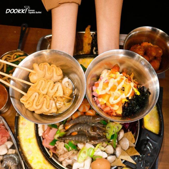 Dookki is one of the most popular spots for Tokbokki hotpot, beloved by many food enthusiasts. At Dookki, you can enjoy a buffet-style meal with a time limit to feast on the delicious Tokbokki hotpot, featuring a homemade broth tailored to your taste, accompanied by a variety of rice cakes and toppings. Dookki's dishes are highly regarded for their warmth and flavor. When it first opened in Saigon, it quickly attracted the attention of food lovers, especially young people.