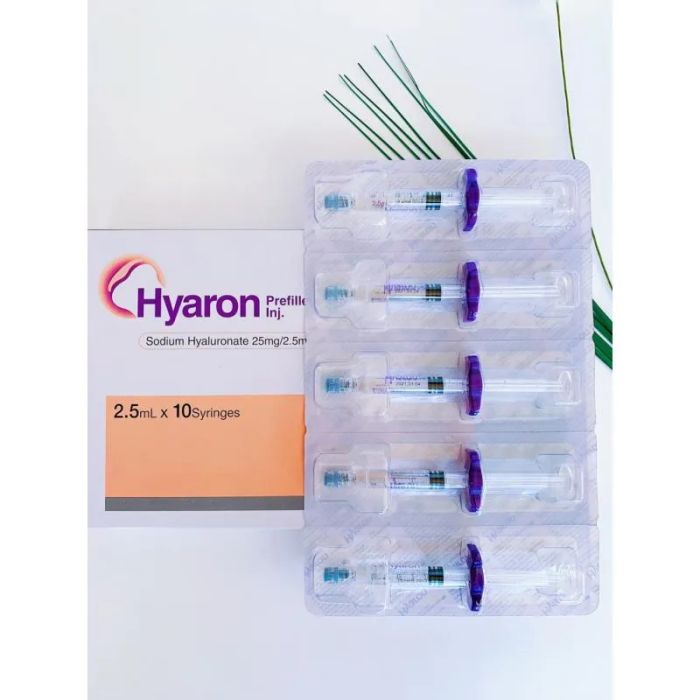 Each 2.5 ml vial of Hyaron Injection contains 25 mg of Sodium Hyaluronate – a salt form of Hyaluronic Acid.