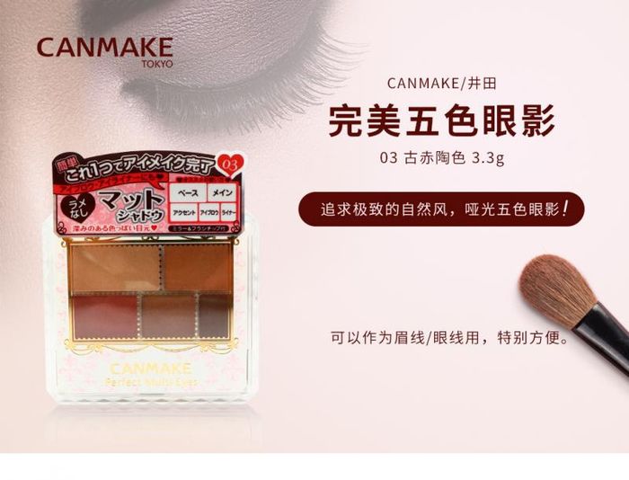 Canmake Perfect Multi Eyes is a professional eyeshadow palette that blends both smooth powder and shimmering powder for long-lasting color with a flawless finish. It features a range of shades, from nude tones to soft shimmer, perfect for both eyeshadow, blush, and highlight applications.