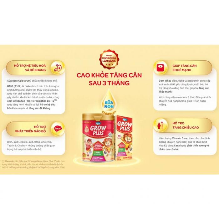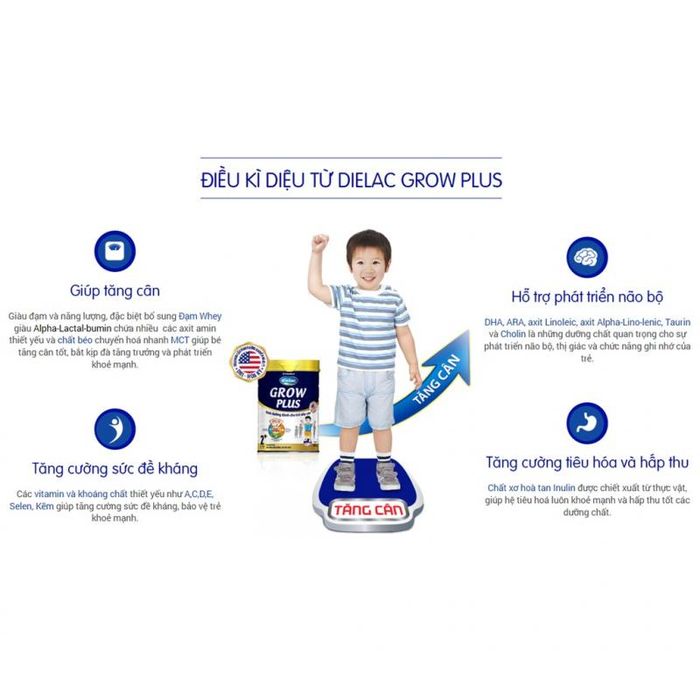 Vinamilk Dielac Grow Plus (Green) is a product designed to help underweight and malnourished children gain weight and height effectively. Its "Gain Weight" formula is energy-dense, supplemented with Whey protein and MCT (Medium Chain Triglycerides) fat, making it easily absorbed and aiding rapid weight gain.