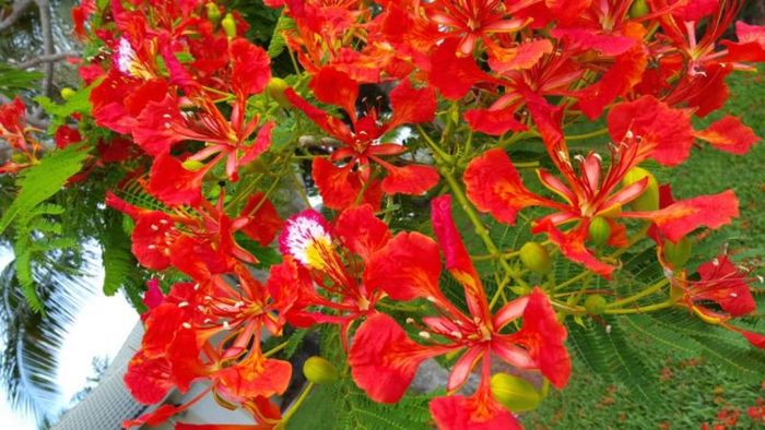 - Flowers: Shaped like a phoenix's tail, with five large red petals, the fifth petal is straight, featuring yellow-white, orange-yellow, or red-white speckles.