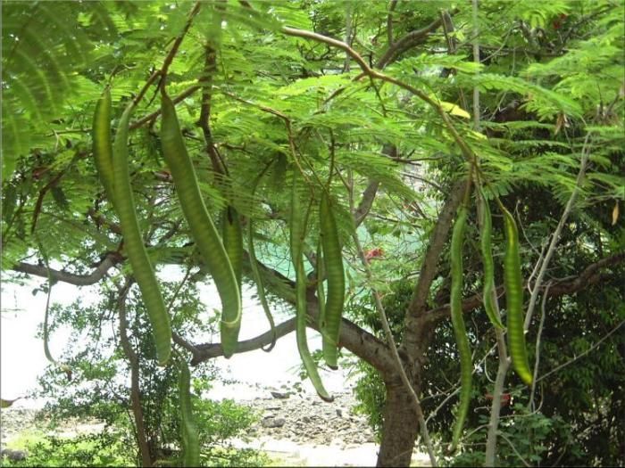 - Fruit: A legume that turns dark brown when ripe, long and heavy.