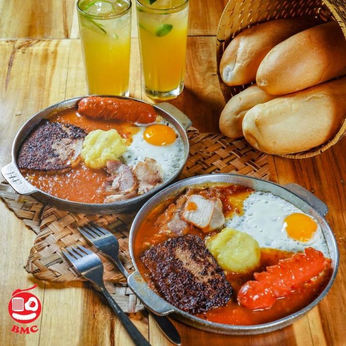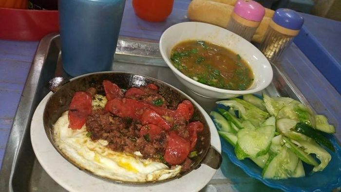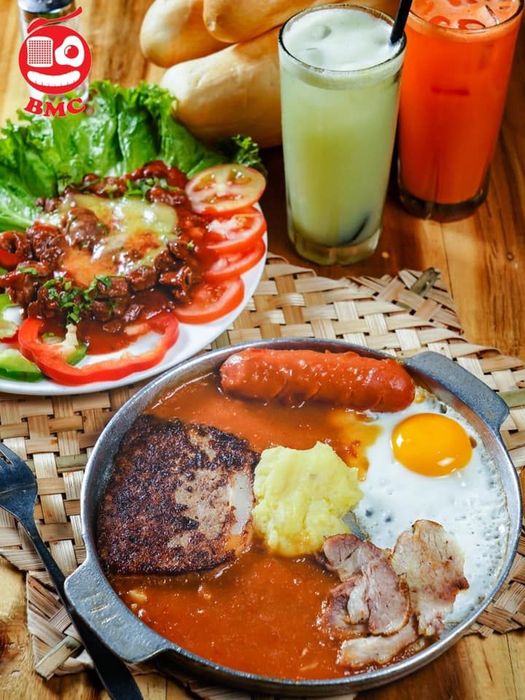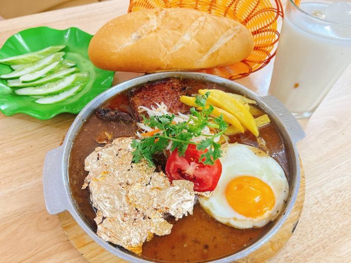 The bánh mì chảo is served with tomato sauce, pâté, sausage, fried eggs, meat, mashed potatoes, fresh herbs, and pickled cucumbers. The sauce blends perfectly with the bread, soaking into every bite. The special bánh mì chảo includes extra sausage and mashed potatoes. At Cột Điện Quán, the famous bánh mì chảo is full of flavor, topped generously with quality ingredients, and drenched in a delicious, creamy, sweet-and-sour sauce. The combination of sausage, egg, pâté, and tender beef immersed in rich sauce is irresistible.