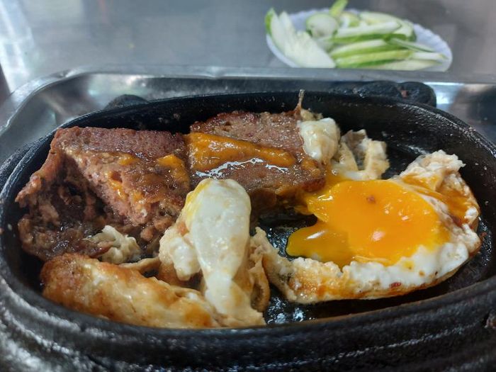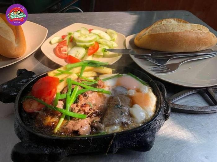 Located on Bà Triệu Street near Vincom, the Hiệu Lực Skillet Bánh Mì shop offers a spacious environment with both indoor and sidewalk seating. A traditional skillet bánh mì here includes eggs, pate, sausage, and cold cuts. Although the skillet is small, it's packed with delicious ingredients that make for a charming and satisfying presentation. This shop is one of the rare places that still preserves the authentic flavor of classic skillet bánh mì, served with ham, sausage, pate, fried eggs, and pickled cucumber on the side.