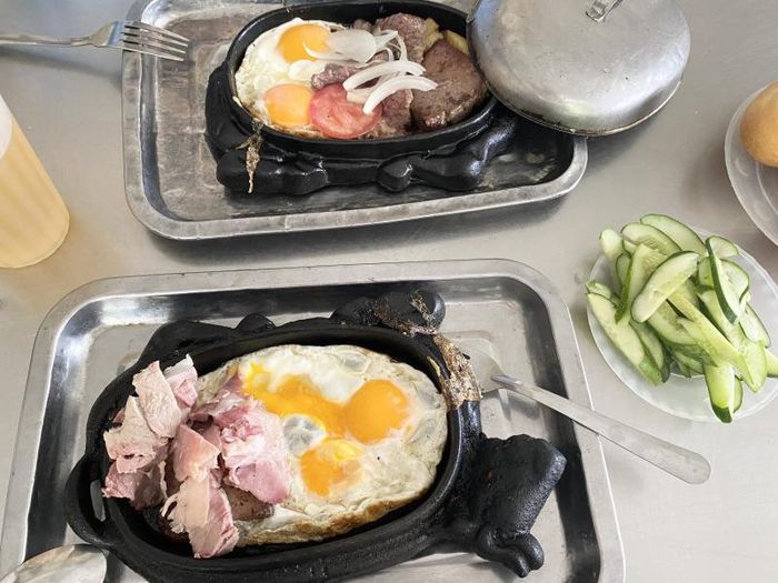 Phúc Skillet Bánh Mì offers a spacious seating area, both indoors and on the sidewalk. For just 30,000 VND, you can enjoy a plate filled with ham, sausage, pâté, and a fried egg, served with a fresh, crusty baguette. The pâté is soft and aromatic, perfectly fried without becoming soggy, and the slices of ham are generous. Pickled cucumbers are available for you to enjoy as you like. What makes Phúc Skillet Bánh Mì stand out from others is that they do not use any sauce. The pâté is light and airy, fried to perfection, offering a unique taste. The bread, paired with various toppings, dipped in a bit of chili sauce, makes for an incredibly delicious meal. The entire dish is served with a warm, crispy baguette, and if you wish, you can order a cup of rich, creamy soy milk to accompany your meal.