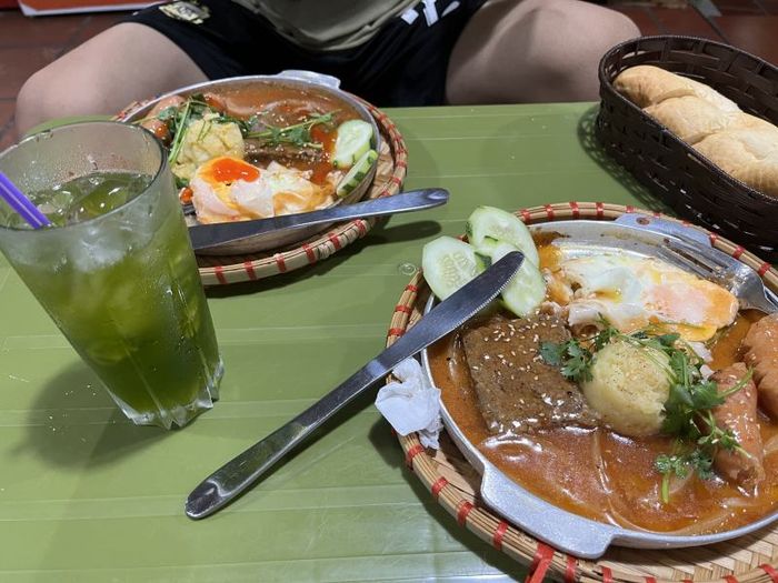 If you're a fan of bánh mì and enjoy exploring street food, Cột Điện Quán is a must-visit. This iconic bánh mì chảo spot in Hanoi offers a few standout dishes: the full bánh mì chảo, the regular bánh mì chảo, and the special bánh mì chảo with beef stew. The beef stew at Cột Điện Quán is just as impressive as their famous bánh mì chảo, featuring a rich, thick sauce with a fragrant herbal aroma. The tender beef, made from rib meat, has a mild spice to it. The whole dish combines flavors, colors, and scents into an unforgettable experience.