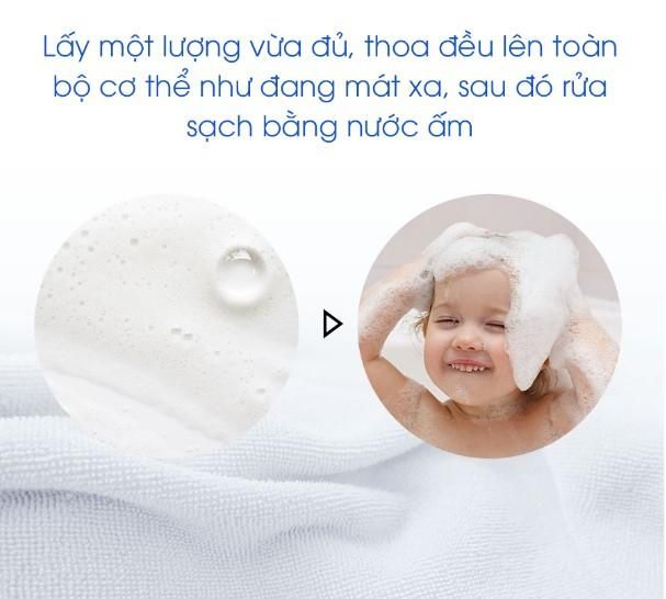 - Dispense an adequate amount onto your hands or a bath sponge and gently lather on your baby’s skin and hair.