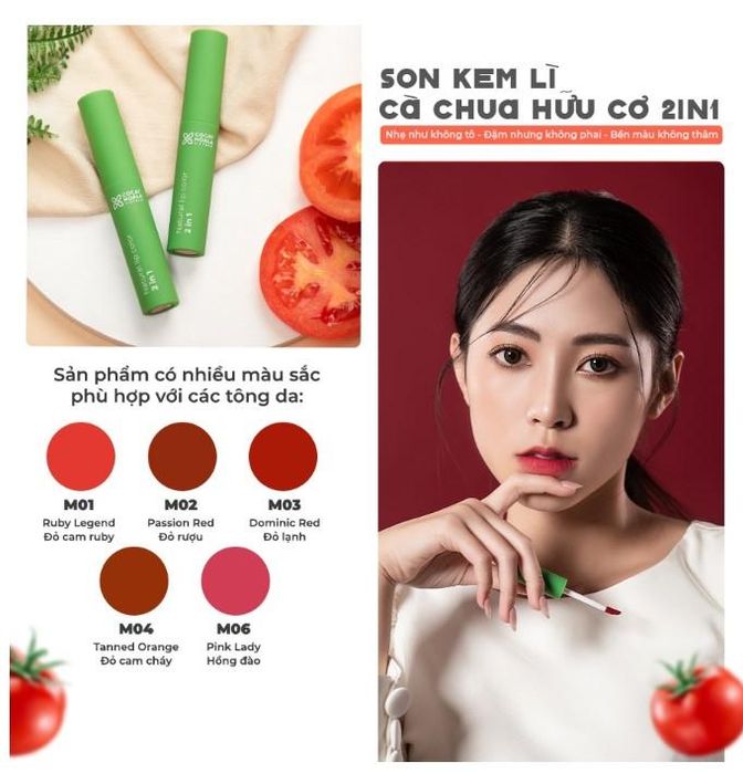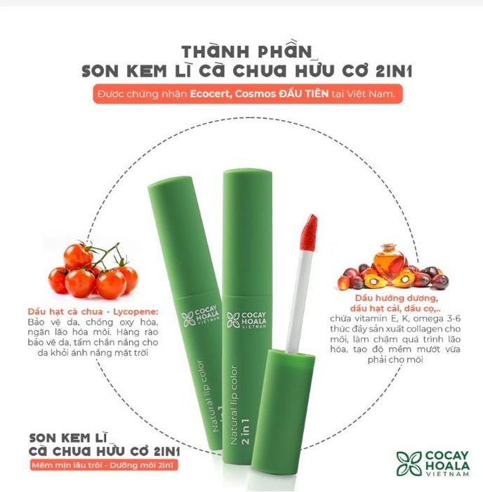 Purchase Link: shopee.vn/-MUA-1-TẶNG-1-Son-kem-lì-cà-chua-hữu-cơ-Cocayhoala-Mềm-mịn-lâu-trôi-Dưỡng-môi-2in1-Bền-màu-cả-ngày-Trọng-lượng2.5-i.24191239.10675812300?