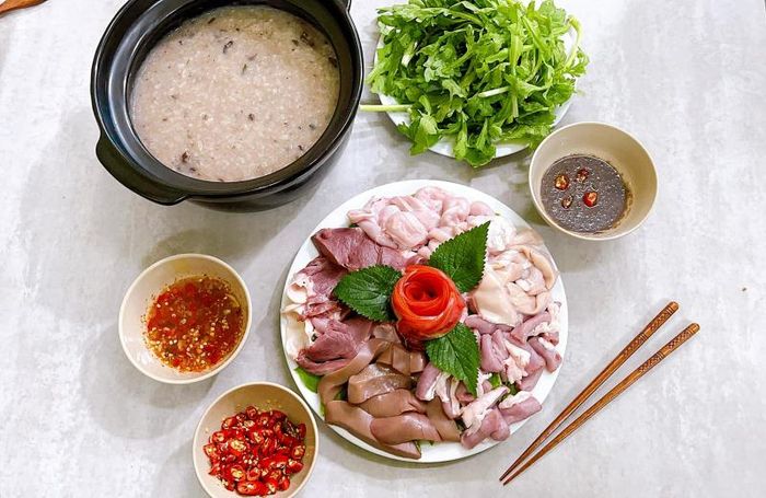 If you're a fan of pig's stomach porridge, you’ve probably heard of the Cháo Lòng Số 4 Đào Duy Từ restaurant. It's often called the best spot for pig’s stomach in the Old Quarter, and for good reason. Here, you’ll enjoy the familiar, simple taste of Hanoi’s classic dish: a hearty bowl of porridge filled with fresh, tender pig’s stomach, served with aromatic herbs and soy sauce. It's a perfect meal that leaves you completely satisfied. A bowl of this dish, priced at just 150,000 VND, offers a generous serving of various pig’s organs, including intestines, liver, and lungs—enough for two people to eat to their heart's content.