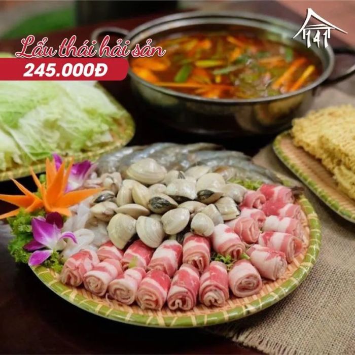 When visiting Nhà sàn 141, it's a must to try their famous hot pots. The restaurant offers a range of delightful hot pot options, but for something truly unique, don't miss the chicken porridge hot pot. Savoring this dish, you'll experience the tender texture and fresh, sweet taste of the chicken, complemented by the rich flavor of its organs, eggs, and meatballs, along with the freshness of the vegetables that complete this special meal.