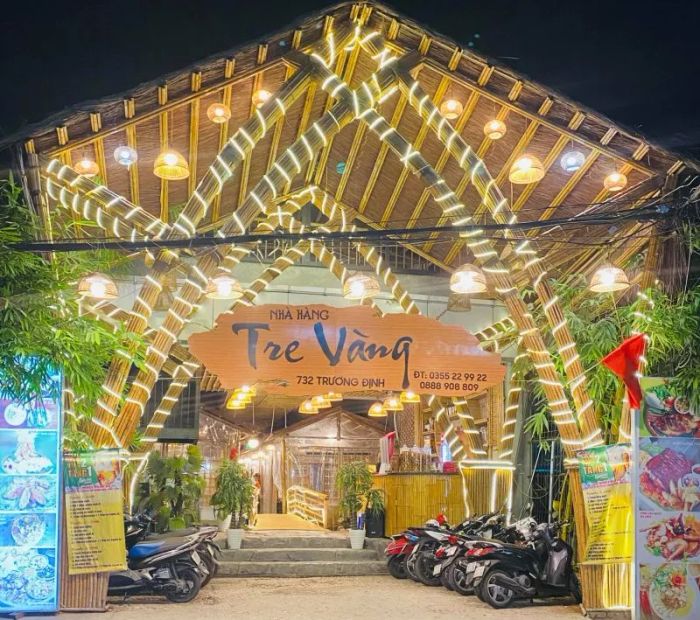 Tre Vang Restaurant features a spacious and impressive environment, with traditional Northern Vietnamese design and décor. This is a must-visit spot offering a wide range of delicious dishes from all corners of Vietnam, featuring fresh, high-quality ingredients carefully selected by the restaurant's chefs. From river fish like catfish, lung fish, to grilled meats such as goat, chicken, and pigeon, as well as hearty local hot pots like pigeon soup or crab broth with beef, Tre Vang has it all. The restaurant also offers a relaxing atmosphere with two large floors, seating up to 400 guests, designed with bamboo and rattan walls, warm yellow lighting, wooden walls, and bamboo branches.