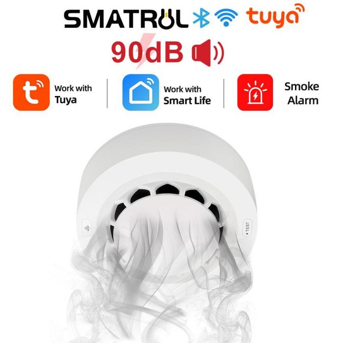 SMATRUL Smart Wireless Smoke Alarm 90dB WiFi features a photoelectric smoke sensor and connects via smart WiFi to your mobile phone. With its modern design and affordable price, it's an ideal choice for your home. This fire alarm is a high-quality device used in high-rise buildings, industrial sites, warehouses, and fire-prone areas to detect smoke and emit an alarm sound to help extinguish fires early, reducing the risk of fires and explosions.