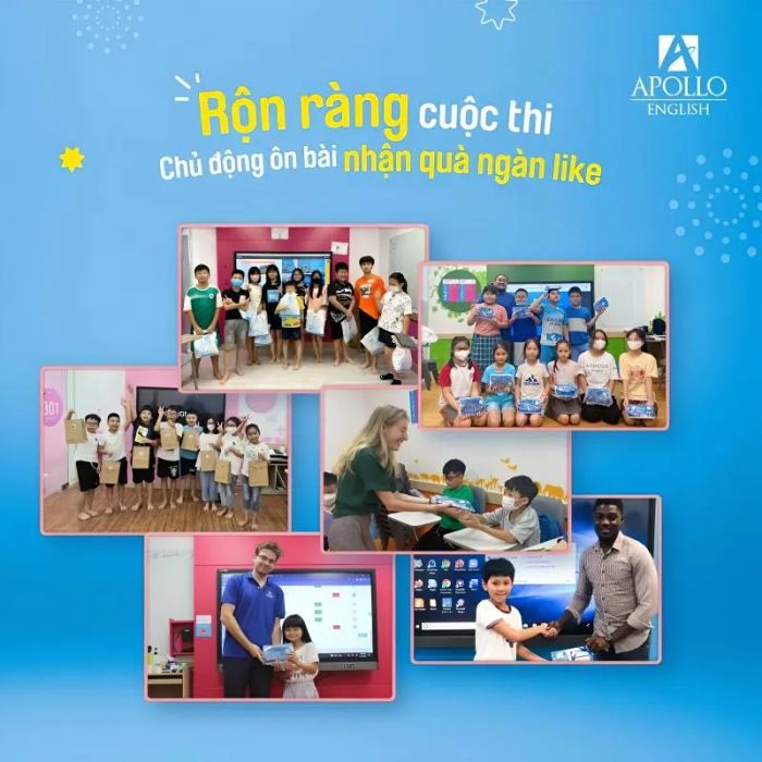 With the motto “where the best become better,” Apollo strives continually to be Vietnam's top English language training center. In addition to its commitment to teaching English in Vietnam, Apollo is also actively involved in social activities such as offering scholarships, organizing extracurricular events, providing teacher training in schools, and participating in popular TV programs like “Rung Chuong Vang,” “Duong Len Dinh Olympia,” and “Ket Noi Tre.”