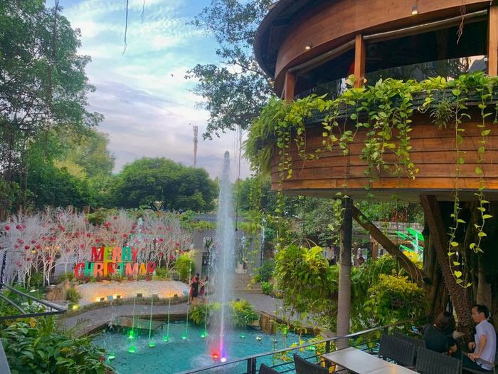 The space is carefully designed with architectural attention, divided into different sections, each with its own unique style. There are outdoor and indoor areas, all decorated with lush greenery and sophisticated, elegant touches. At night, the cafe hosts a stunning water music show, a first in Gò Vấp, and the best part is, it’s completely free of charge.