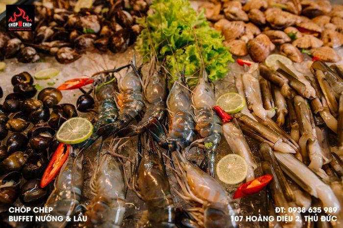 Chop Chep BBQ & Hotpot Buffet is an enticing restaurant specializing in seafood BBQ and hotpot buffets, located at 107 Hoang Dieu 2, Thu Duc, Ho Chi Minh City. This is the perfect place for seafood and hotpot enthusiasts. Chop Chep Buffet is renowned for its cozy and elegant atmosphere, providing a delightful dining experience for its guests. The restaurant offers a wide selection of fresh seafood such as shrimp, crab, oysters, scallops, and various fish. Guests can even choose and grill their favorite seafood on personal grills right at their table.