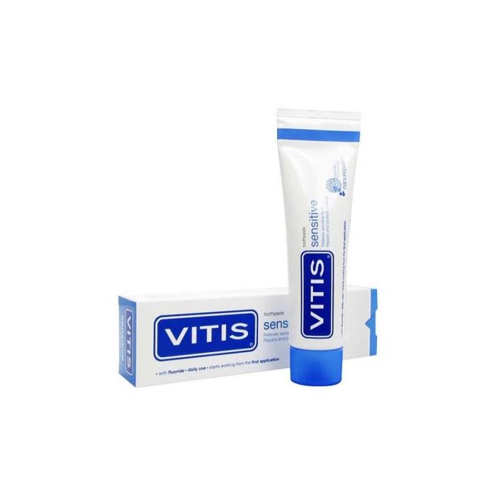 Vitis Sensitive Toothpaste is formulated with Potassium Nitrate and Fluoride to effectively prevent tooth sensitivity, firm up gums, prevent cavities, and remineralize enamel. It is especially beneficial for preventing sensitivity after dental treatments like teeth whitening and periodontal therapy.