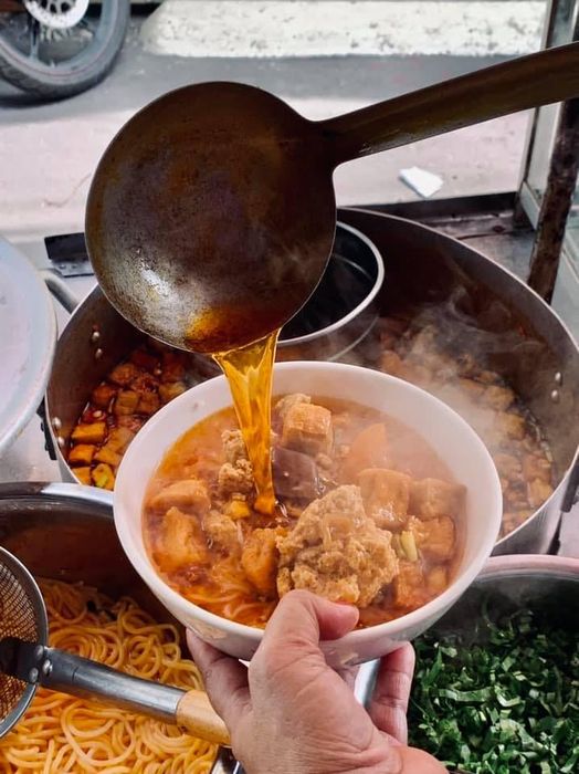 When visiting Hanoi, you definitely can’t miss the Thanh Xuân District, often regarded as a food lover's paradise with a variety of delicious dishes. One standout option is Bún Riêu 66 Vũ Trọng Phụng, perfect for those wanting a bowl overflowing with toppings. Over the years, the flavor of the bún riêu here has captivated countless generations of foodies. The restaurant reveals that it went through several phases of improving its recipe before arriving at this diverse combination of ingredients. Every component in the bowl is generously sized, filling the entire bowl. The tomatoes are left whole, and patrons can crush them with a bit of shrimp paste, tamarind, and lime for extra flavor.