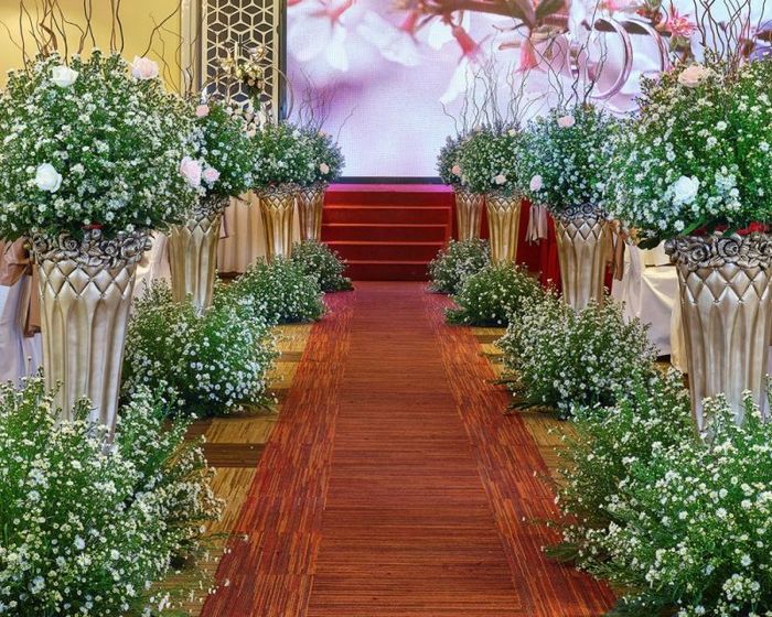 You can freely choose your preferred color theme for the venue. Each color not only brightens the wedding but also carries its own significance for this special day. For instance, Gold (Tulip) symbolizes success and wealth; Red (Rose) represents passionate love, Violet (Violet) stands for loyalty and romance, and Green (Calla) signifies new hopes.