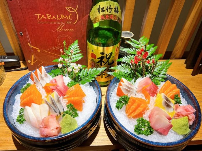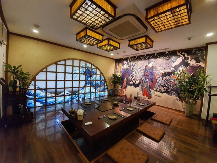 Located on Kim Mã street, a well-known area in Hanoi, Taraumi Restaurant is a favorite destination for those passionate about Japanese cuisine. When you visit Taraumi, you'll be captivated by the restaurant’s design, which blends classic and modern Japanese styles. The restaurant offers a variety of rooms to suit different needs, each decorated with elements of Japan's traditional beauty, such as pine trees, koi fish ponds, and red maple trees. Each room offers a private space, accommodating between 4 and 30 people, making it perfect for business meetings, friend gatherings, or family reunions.
