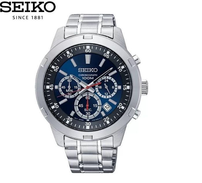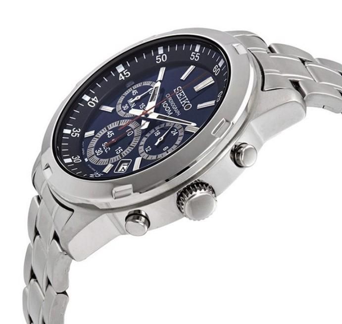 What sets the SKS603P1 apart is its striking dial with a deep blue-black background, displaying the main time and three sub-dials, all highlighted by a bold red second hand. With a 43mm diameter and 12mm thickness, it is an ideal choice for individuals with medium to large wrists. The stainless steel bracelet adds sturdiness, enhancing its durability. This stylish watch offers a premium look at an affordable price.