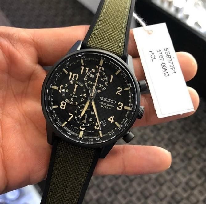 Just as earrings enhance a woman's beauty, a watch is the accessory that emphasizes the masculinity and elegance of a true gentleman. This is why refined, classic watches have always been valued by men of distinction. The Seiko Chronograph SSB373P1 is part of Seiko's quartz chronograph collection, boasting a bold and rugged look. The dark steel case, black dial with a neat square pattern, and army green Nato strap immediately capture attention. The design is strong, dynamic, and effortlessly stylish, appealing to the modern man.