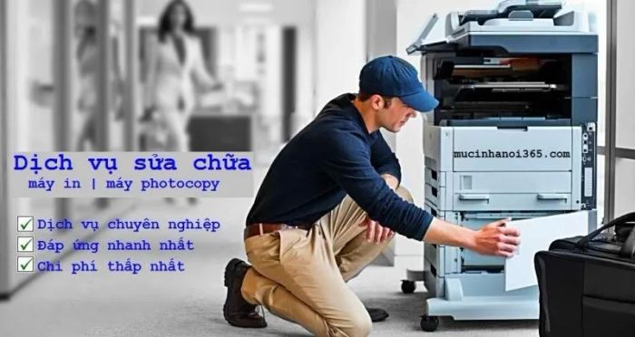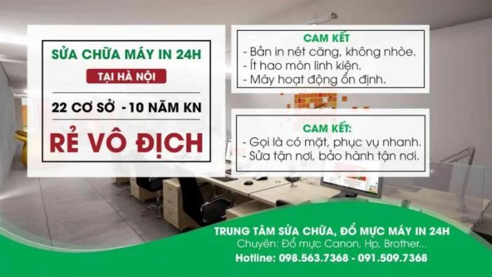 Hanoi Office Machines Co., Ltd. guarantees: 24/7 repair service availability with no long waits, the most reasonable prices, and quality spare parts at affordable costs. All printer components will be preserved during repairs. When the printer is taken for service, a temporary replacement printer will be provided. They also offer reliable maintenance and post-repair warranties.
