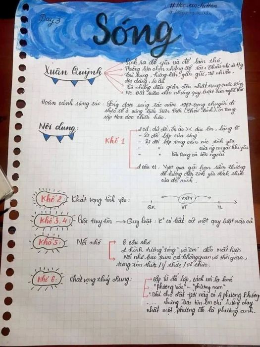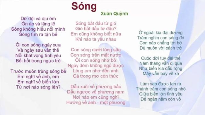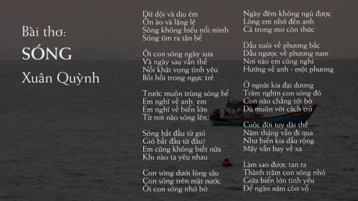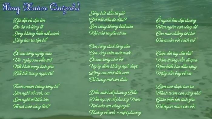 However, in her poem 'Waves,' Xuân Quỳnh creates the perfect melody for love between two people. The waves represent the laws of the universe and the ocean. The idea of 'waves missing the shore' is then linked to 'me,' and the feeling of 'my heart misses you...' is a beautifully surprising and interesting comparison.