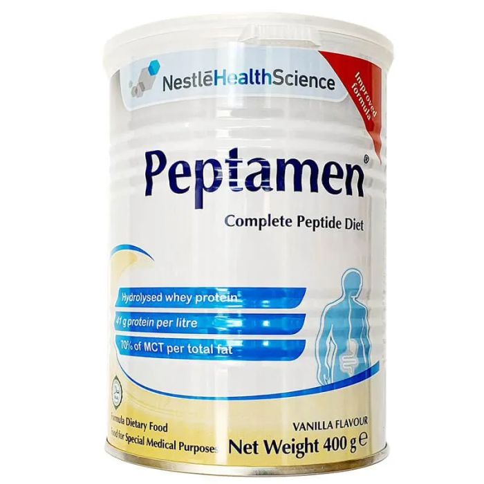 Peptamen is a specialized nutritional product for individuals with poor absorption or those recovering from illness, particularly cancer patients who need rapid recovery. Developed by the renowned Nestlé group, Peptamen has been highly regarded for its quality over the years. Designed for individuals aged 10 and older, this milk is not recommended for children under 10. It provides balanced nutrition with essential nutrients suitable for those with impaired digestion, ensuring daily nutritional needs are met. Peptamen can also be administered via a feeding tube for patients who are unable to consume food orally.