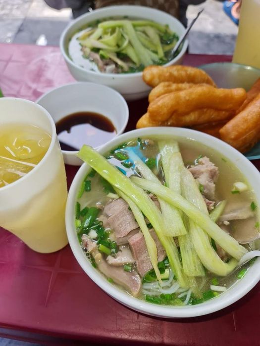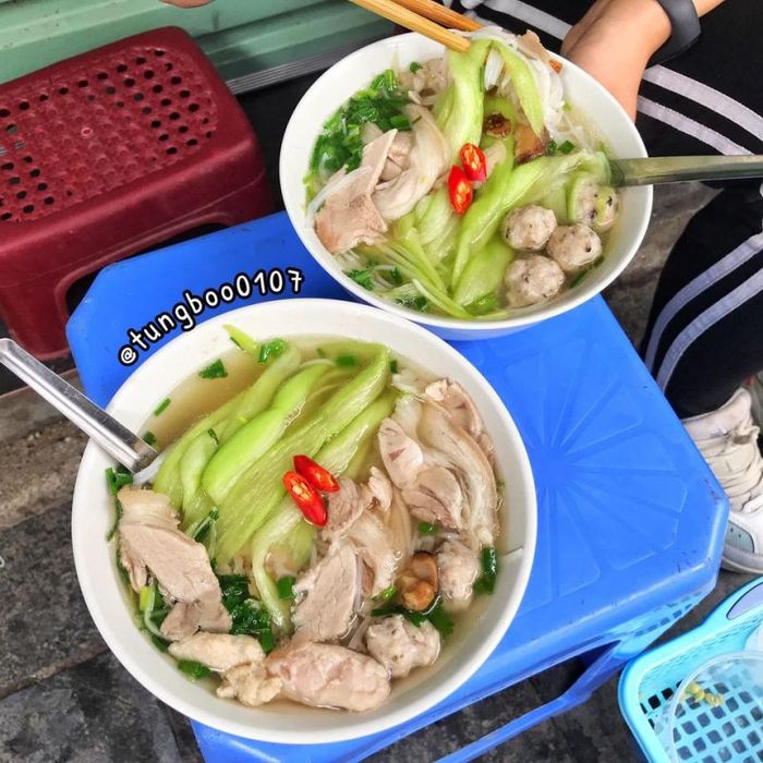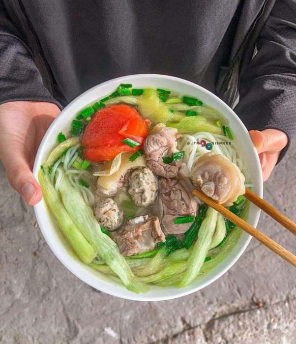 The bún dọc mùng here features a rich, savory broth made by simmering bones, providing a natural sweetness that’s distinctly different from the taste of monosodium glutamate. The ingredients at the owner’s counter look fresh, clean, and well-organized, leaving customers impressed. Each bowl of bún is generously packed with soft, sweet meatballs made with wood ear mushrooms, some crispy bamboo shoots, and dọc mùng cut into tender, crunchy pieces. The meat and trotters are fresh, with thinly sliced, tender meat that’s never tough. The portion of bún is just right, but if customers want more or less, they can let the owner know. For an extra treat, adding crispy fried dough sticks and an iced tea makes for a perfect, satisfying breakfast!
