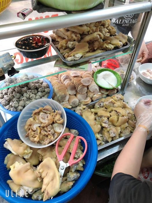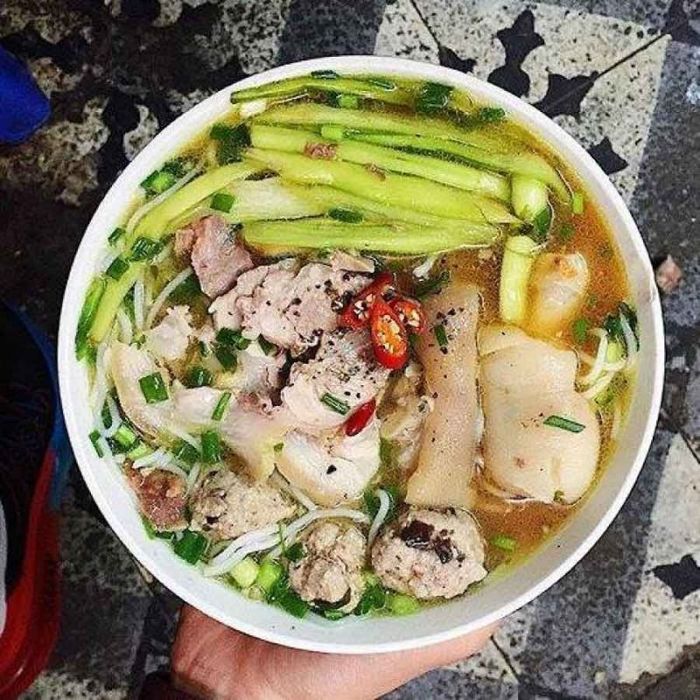 Once you've placed your order, your bowl of Bún will be served promptly, and it's impossible not to notice how full and generous it is, including noodles, bamboo shoots, tongue, bamboo shoots, and Mọc. The bamboo shoots are fresh and crunchy, cut into large, long pieces, and do not have any bitterness. The broth is clear and, although there are no tomatoes in the recipe, it is still wonderfully sweet, fragrant, and light. For those who enjoy tongue, it can be added to the bowl, sliced thinly and perfectly seasoned. The Mọc balls, though handmade and not the most aesthetically pleasing, are incredibly tasty. A touch of sourness from the bamboo shoots, the spiciness of the chili, and the fragrance of garlic bring this dish together. You can also choose from various accompaniments such as pig's trotters, tail, fresh or dried bamboo shoots to enhance your meal.