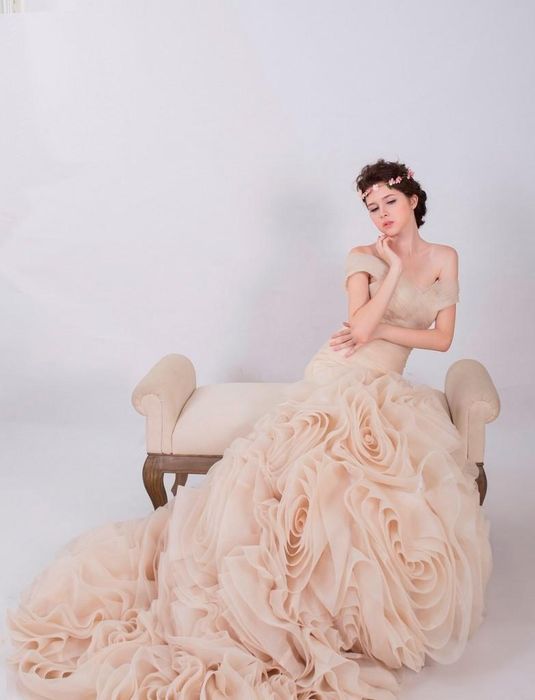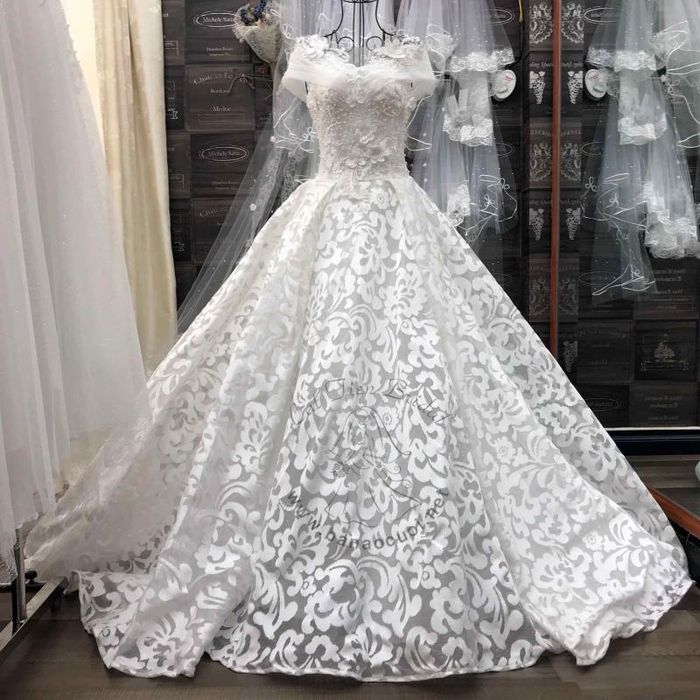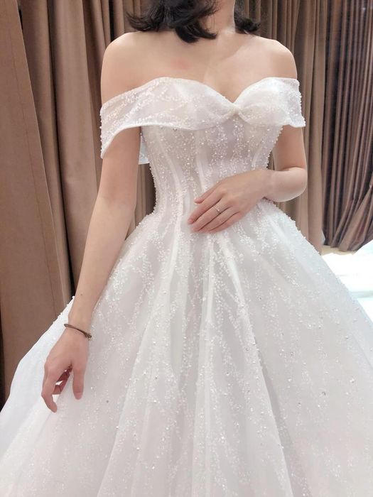 The off-shoulder wedding dress is the perfect and elegant choice. This design isn't overly revealing or provocative, yet it brings a touch of allure by delicately showcasing the bare shoulders and slender neck. Off-shoulder wedding dresses come in various styles, such as asymmetrical shoulders, fitted shoulders, or voluminous ones. Brides with broader shoulders may feel less confident about this design, fearing it might unbalance their silhouette. However, opting for an off-shoulder dress with a flowing skirt can cleverly conceal any body flaws.