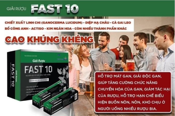 Fast 10 Hangover Solution is a health supplement made from herbal ingredients such as Khúng Khéng extract, Diệp Hạ Châu, Gai Leo, and more. It is designed to aid in alcohol detoxification, enhance liver function, and is recommended for individuals who consume large amounts of alcohol.