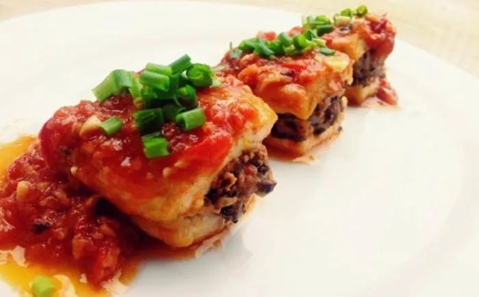 The first dish is called "TAM SẮC MỸ NHÂN" (Three-Colored Beauty): tofu stuffed with minced meat, fried and served with tomato sauce and fresh lettuce, paired with soy sauce for dipping. This dish is named for its three distinct colors, each symbolizing different aspects of a woman’s virtues: