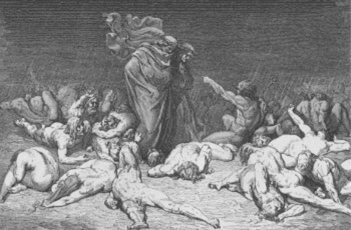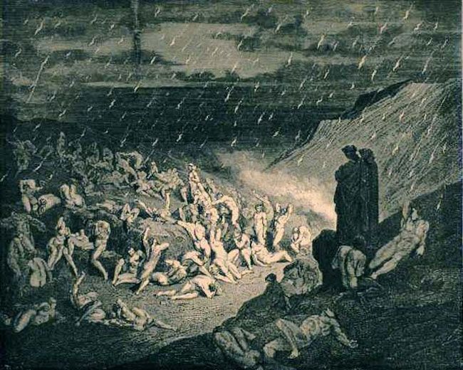 - Souls who blasphemed against God and violated the natural order set by God, such as engaging in homosexuality. These souls are doomed to wander a desert, endlessly burning in fire with no destination, while fire rains down upon them.