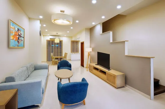 - Tầng 1: Phòng khách, khu bếp và phòng vệ sinh. Phòng khách rộng rãi với sofa, bàn trà, tivi lớn và kệ ngồi nhìn ra khu vườn xanh mát. Phòng bếp có đầy đủ tiện nghi để tổ chức các bữa tiệc gia đình.