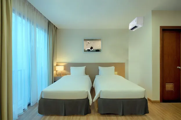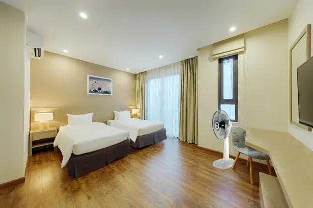 Phòng ngủ được trang bị đầy đủ tiện nghi bao gồm điều hòa, quạt cây, tivi, kệ để đồ, tủ đựng quần áo, và rèm cản ánh sáng để tạo không gian yên tĩnh và thoải mái. Mỗi phòng tắm có đầy đủ đồ dùng cá nhân, máy sấy tóc và bình nóng lạnh.