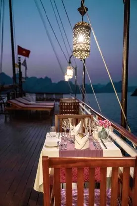 Experience an abundance of unparalleled facilities and features at Heritage Line Violet Cruise - Ha Long Bay and Bai Tu Long.Maintain seamless communication using the complimentary Wi-Fi at cruise. Effortlessly arrange transportation to and from the airport using the cruise's airport transfer services. Reception assistance is offered at the cruise featuring safety deposit boxes. Obtaining passes for the town's top entertainments becomes effortless with cruise's tours. Craving relaxation? Make the most of your stay at the Heritage Line Violet Cruise - Ha Long Bay and Bai Tu Long with convenient amenities like 24-hour room service and room service at your disposal. Kindly note that smoking is prohibited in the cruise to ensure fresher air for all visitors. At Heritage Line Violet Cruise - Ha Long Bay and Bai Tu Long, every guestroom is provided with convenient amenities and fittings to ensure a comfortable stay. Elevate your experience at cruise with the knowledge that certain rooms are equipped with air conditioning, ensuring a more pleasant stay for you.A few accommodations within Heritage Line Violet Cruise - Ha Long Bay and Bai Tu Long offer unique design elements such as a balcony or terrace.Certain rooms boast in-room amusement features such as television and in-room video streaming, offering guests an enjoyable stay. In select rooms within the cruise, bottled water, instant coffee, instant tea and mini bar is available to cater to your requirements when desired.In the cruise, certain guest bathrooms come equipped with essential bathroom amenities, such as a hair dryer, toiletries and bathrobes, ensuring a comfortable stay for guests. Begin your day with a scrumptious on-site breakfast available each morning at Heritage Line Violet Cruise - Ha Long Bay and Bai Tu Long.At the cruise, an assortment of easily accessible and delicious meal choices are available to satisfy your appetite whenever it strikes. Enjoy an entertaining evening with your fellow travelers at the cruise's bar. During your stay at cruise, an array of engaging activities and amenities guarantees a delightful experience. Conclude your holiday perfectly with a visit to massage and spa on your final days.Be sure to drop by the pool at cruise at least once during your stay.